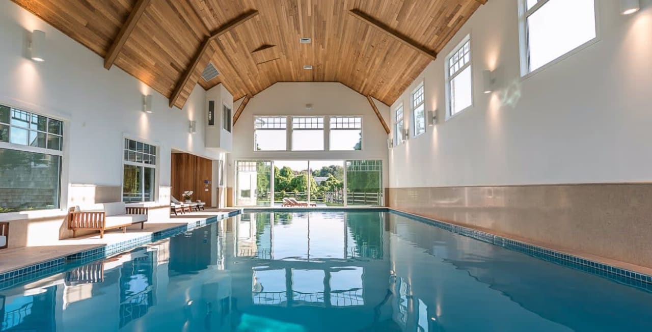 A stunning, LED-lit 65' x 29' indoor pool—the largest private pool of its kind in the Hamptons—inspires audible gasps from even the most stoic of party-goers. Double -sliding glass doors fully retract to merge the pool with the terrace beyond, redefining what it means to own a backyard pool.