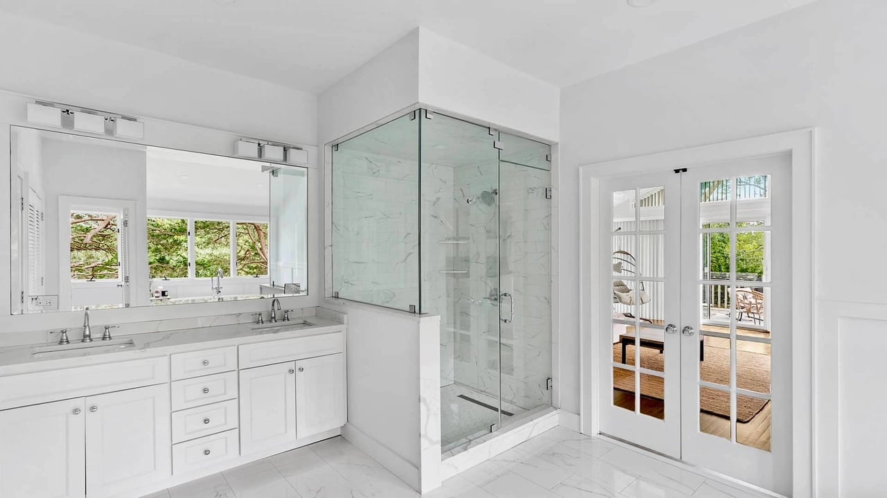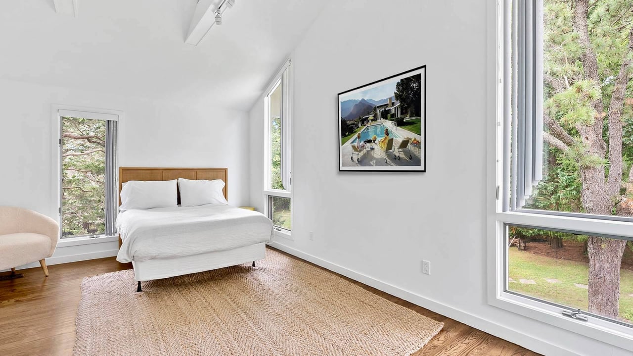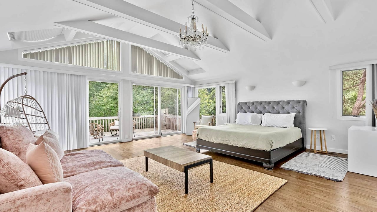 The main level is anchored by three generous bedrooms, including a private junior primary suite that boasts a spa-inspired marble bath and direct access to the poolside terrace. Occupying its own dedicated level, the oversized primary suite serves as a true retreat, featuring vaulted ceilings and a sprawling private sun deck with views over the lush acreage and its own exterior staircase to the pool area.