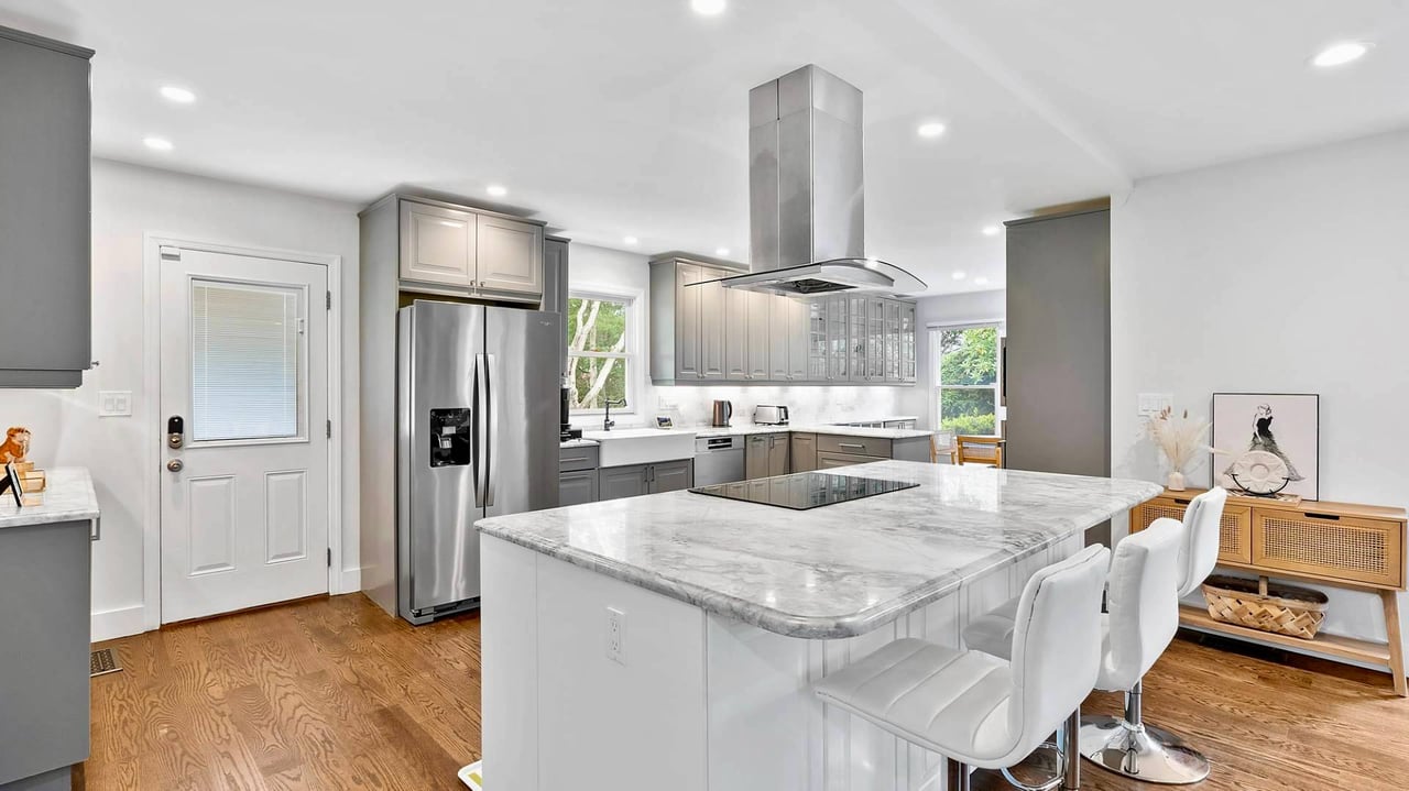 The interiors are defined by an open-concept architectural flow, designed specifically for effortless high-end entertaining. The heart of the home is a designer kitchen featuring sleek marble countertops and professional-grade stainless steel appliances, which transitions seamlessly into the light-filled living and dining areas.
