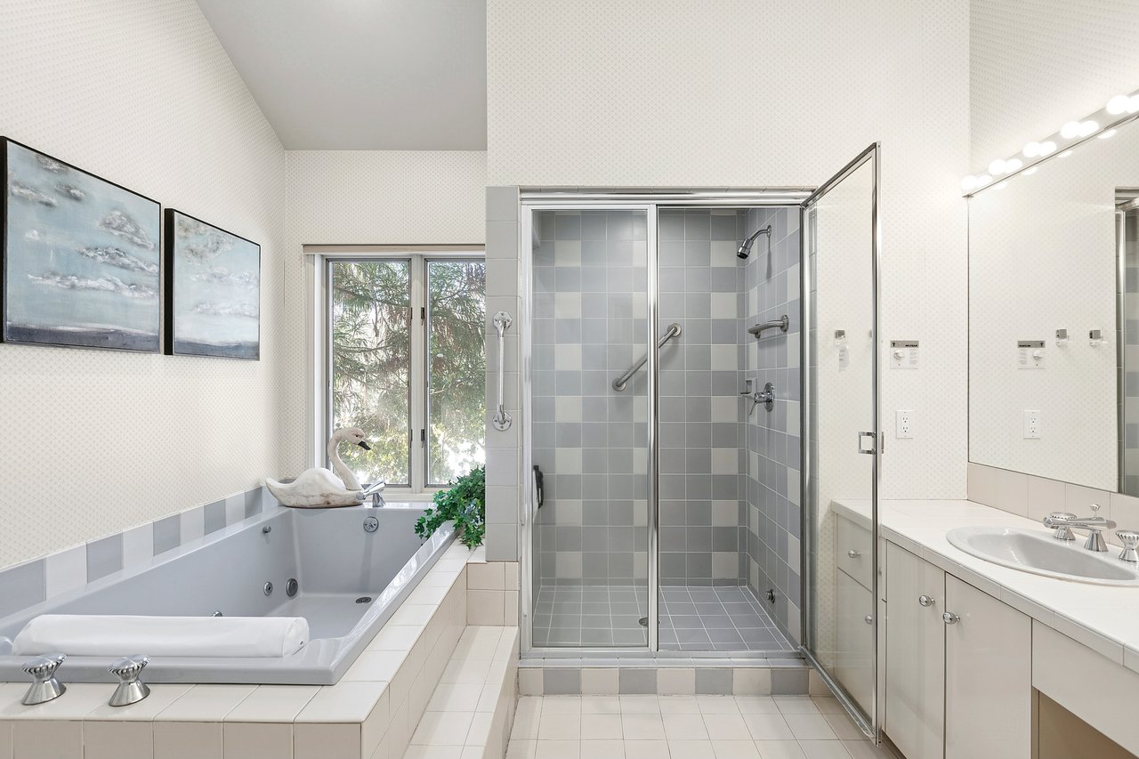 At the center of the home, a well-appointed kitchen opens to expansive living and dining areas, creating an inviting setting for both everyday living and entertaining. Outdoors, a private backyard retreat awaits, highlighted by a 1,950-square-foot deck overlooking a fenced swimming pool—ideal for summer gatherings or quiet relaxation.
